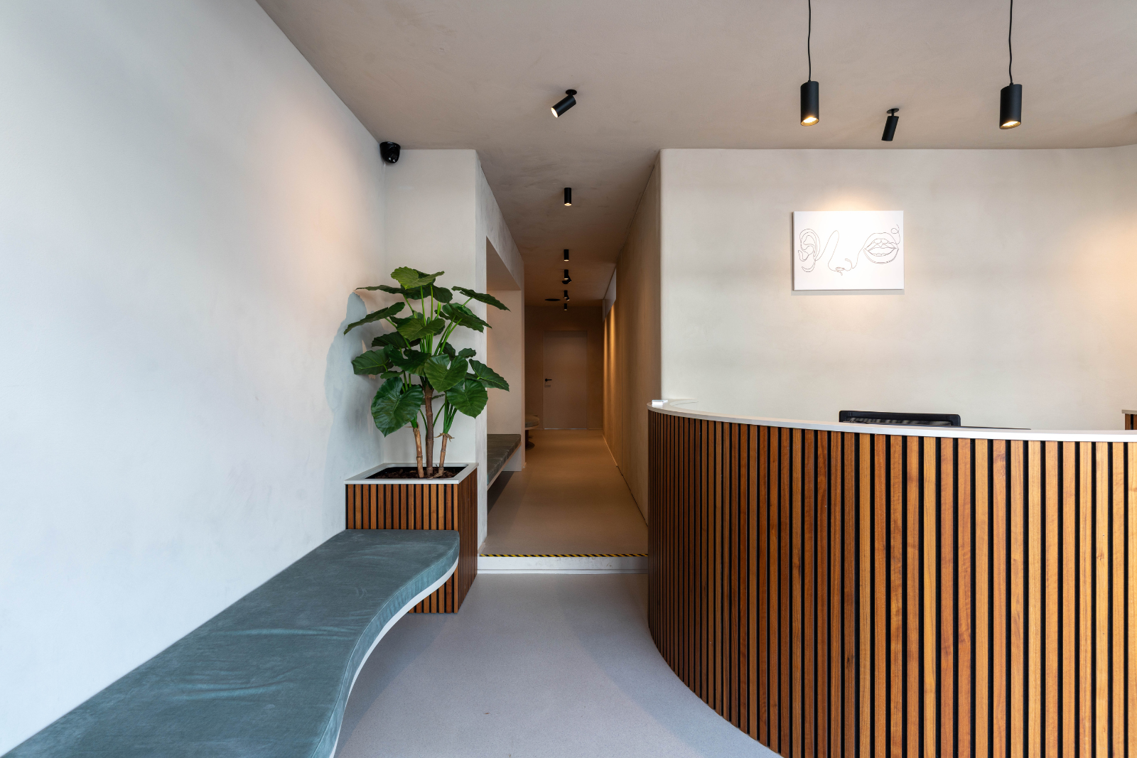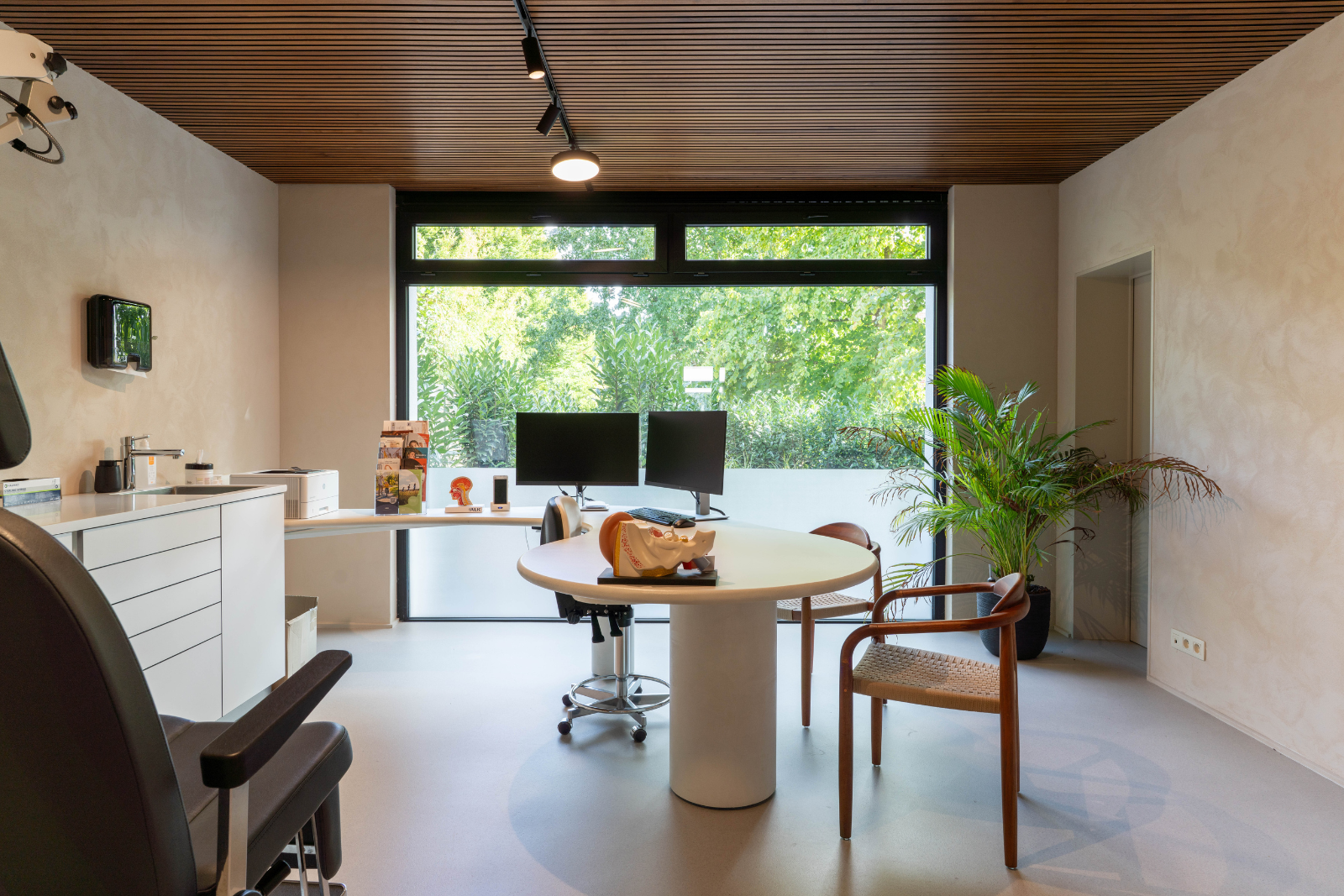 Interieurarchitect Nicolaas Janssens heeft bij het ontwerp duidelijk nagedacht over de identiteit van de praktijk. In de inkomhal liet hij zitbanken ontwerpen in de vormen van een neus, mond en oor, een speelse verwijzing naar NKO. Dit creatieve detail vormt een mooie aanvulling op de praktijk en versterkt de beleving van de ruimte. Daarnaast zorgen de overvloedige lichtinval en het gebruik van lichte kleuren voor een frisse, open uitstraling.