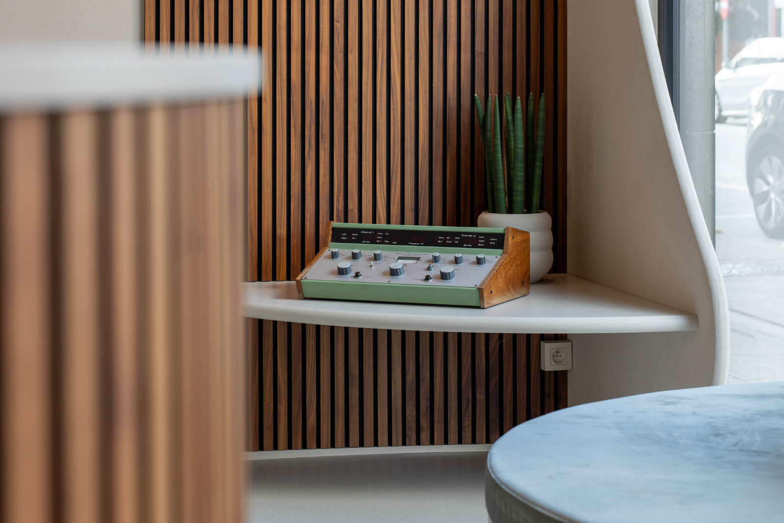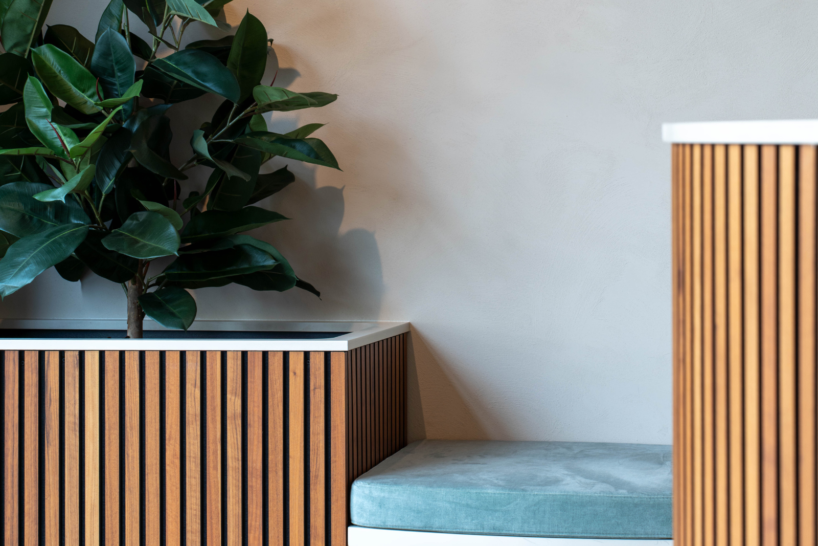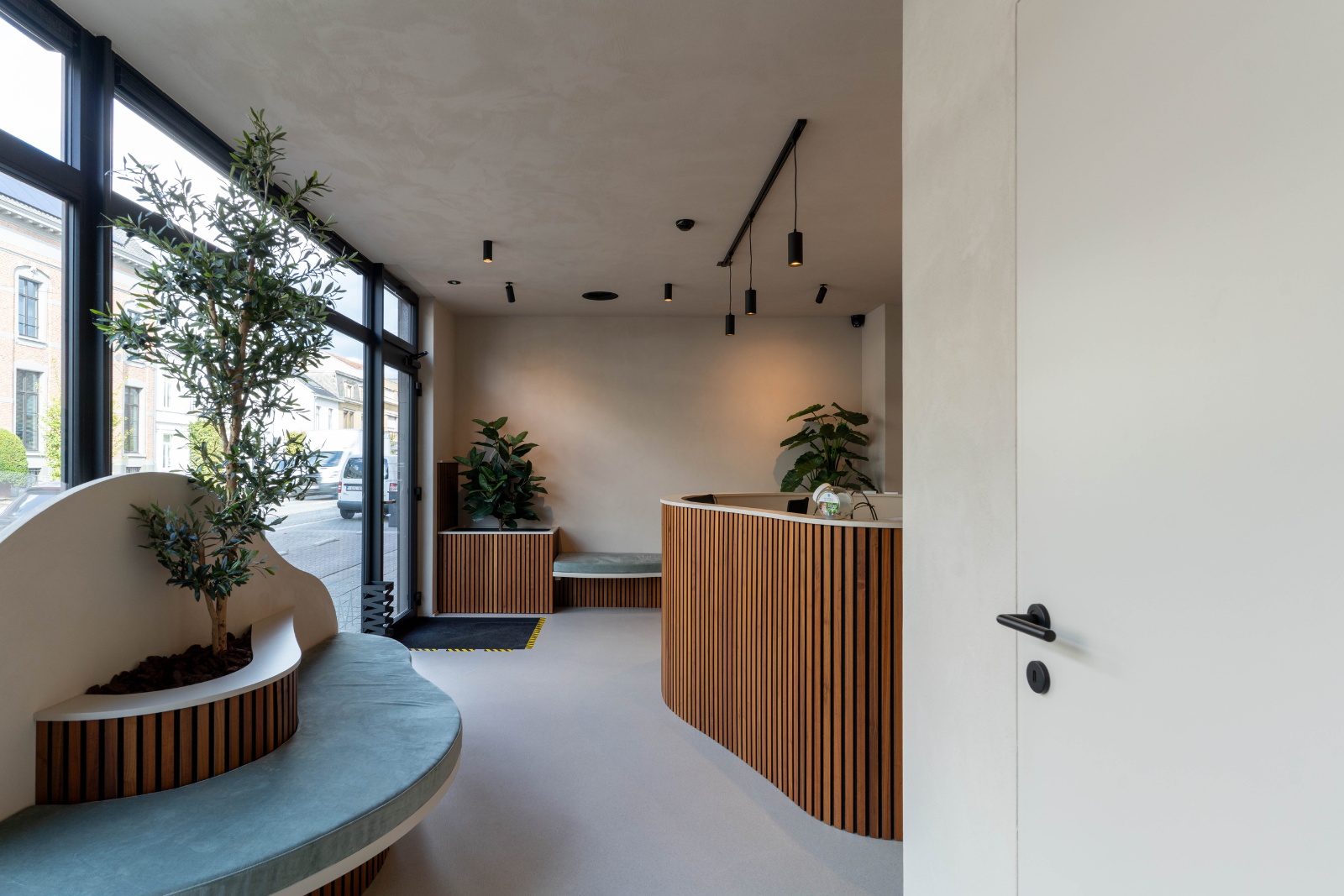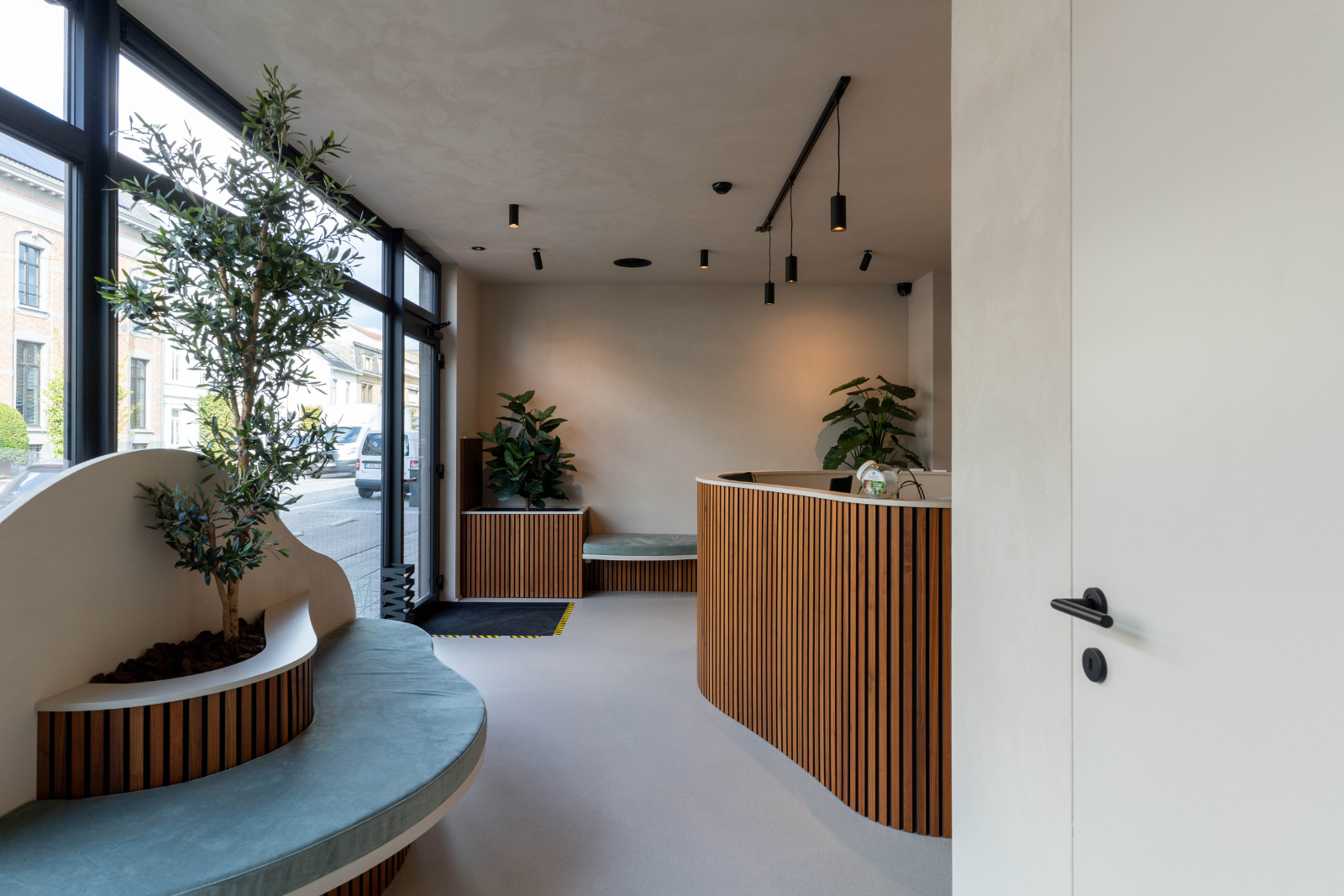 Bij binnenkomst in de praktijk valt het maatwerk meteen op. De balie en zitbanken zijn uitgevoerd in houten lamellen en lichtgroene zitkussens, zorgen voor een frisse en open sfeer. De vormen van de banken sluiten elegant aan bij de ontwerpvisie van de inkomhal, waardoor het geheel harmonieus aanvoelt.