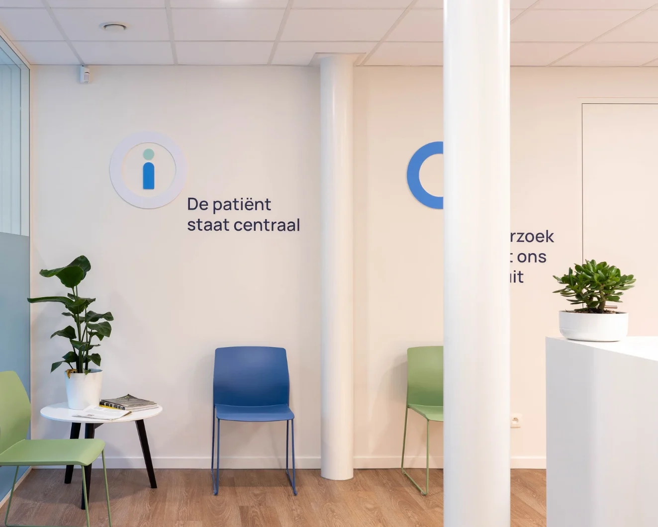 Omdat het om een medische praktijk gaat, was het belangrijk dat de ruimtes een nette en professionele uitstraling kregen. Tegelijk wilden we warmte en contrast toevoegen. Dat deden we door het gebruik van houtdetails, zoals een houten wand, die het geheel een warmere en uitnodigende uitstraling geven. Ook de huisstijlkleuren van het bedrijf kregen een plek in het interieur. Op de muren zijn inspirerende woorden aangebracht die de identiteit en waarden van de praktijk subtiel versterken. Zo wordt de branding consistent doorgetrokken en krijgt de praktijk een herkenbare, eigen uitstraling.