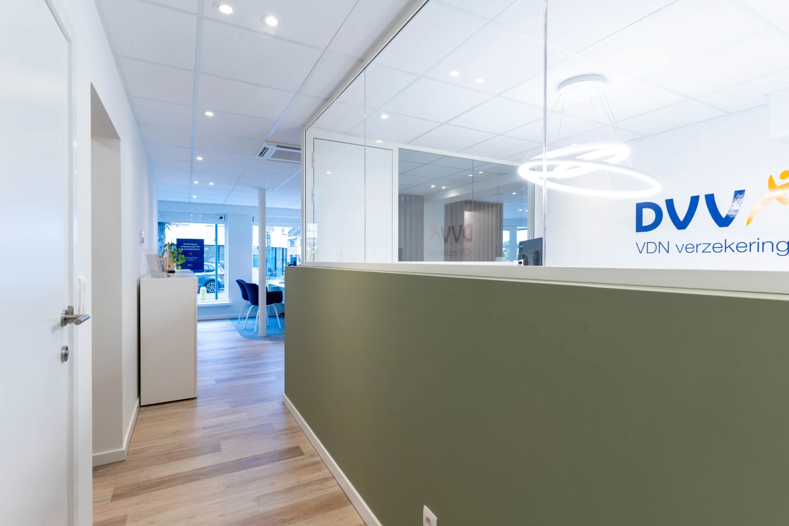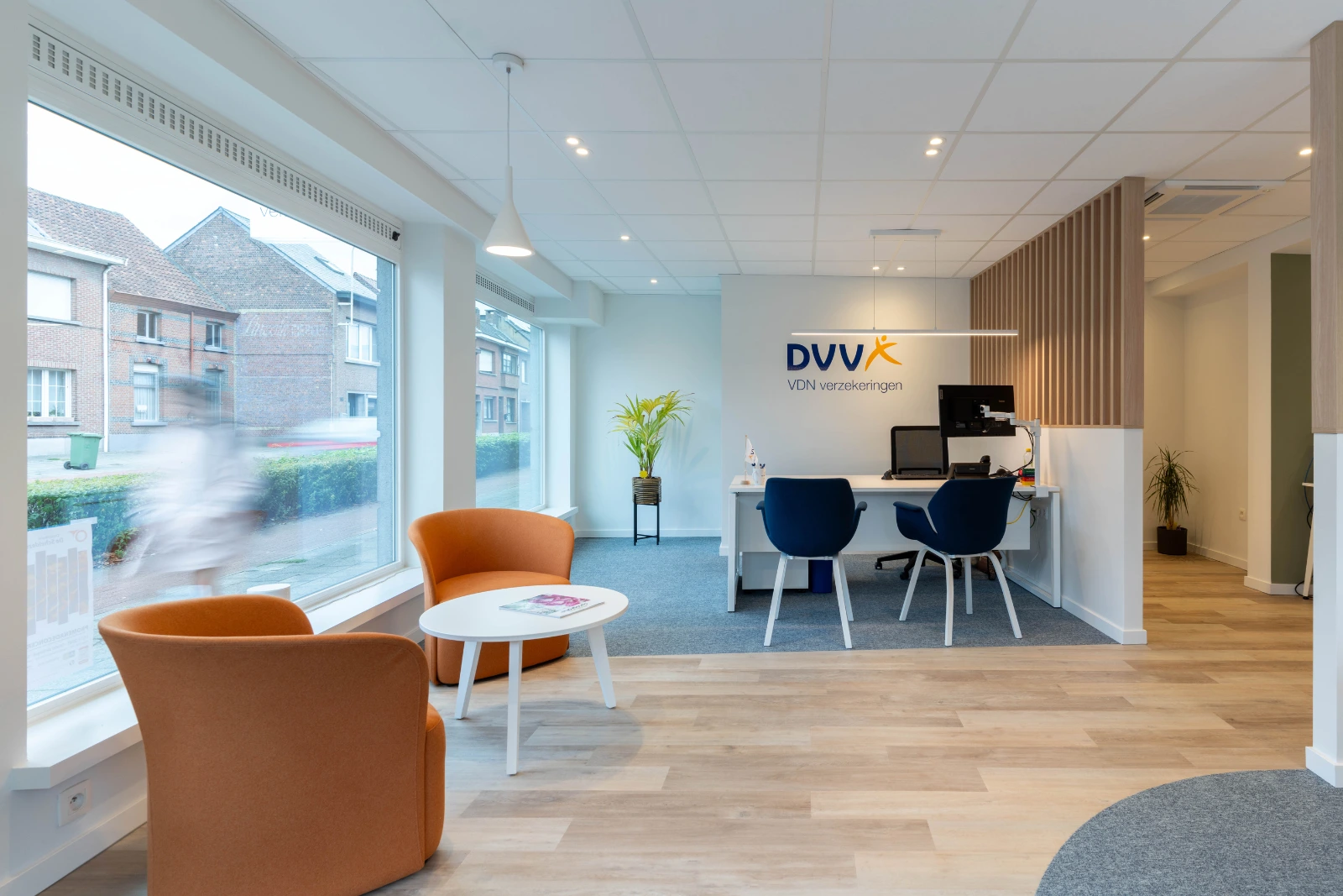 Het interieur weerspiegelt duidelijk dat je in het kantoor van VDN Verzekeringen bent. Dit komt terug in de herkenbare merkkleuren en de muurbestickering die de identiteit van het merk benadrukt. Het resultaat is een warme en uitnodigende omgeving, waar klanten zich meteen welkom voelen.