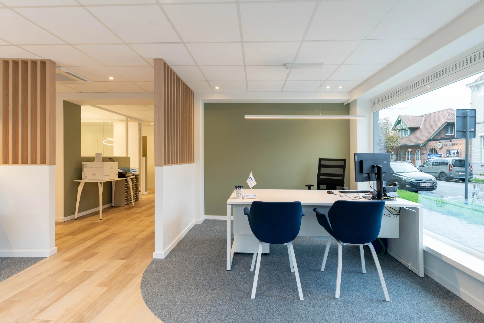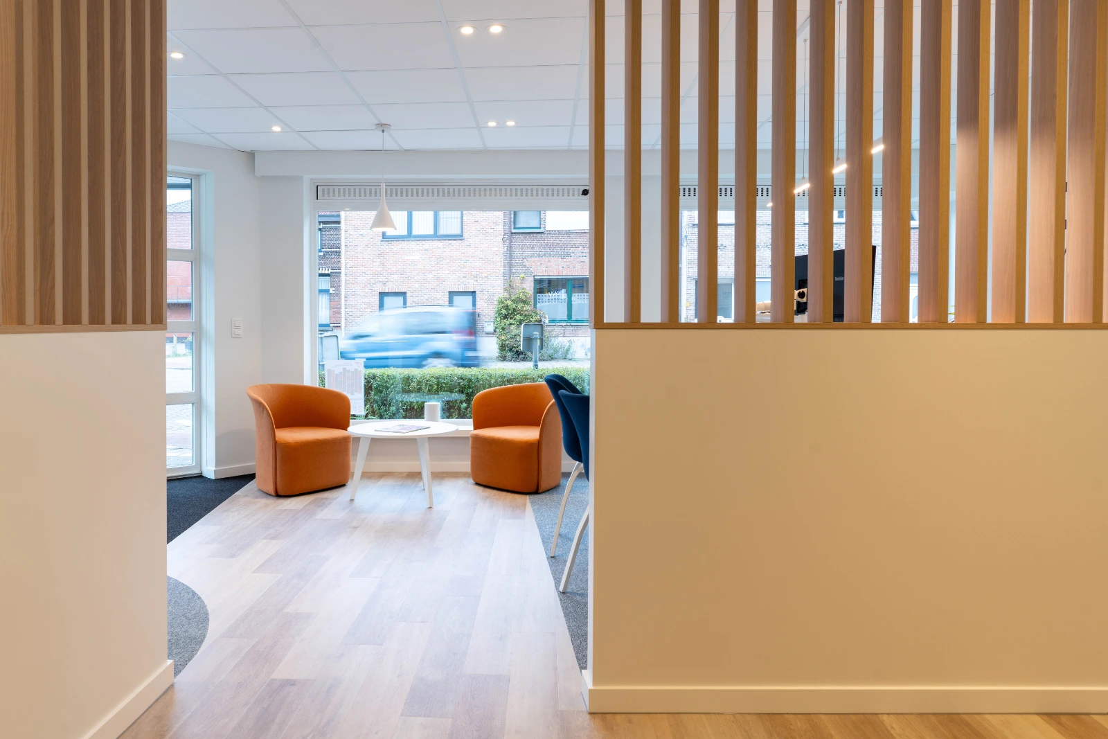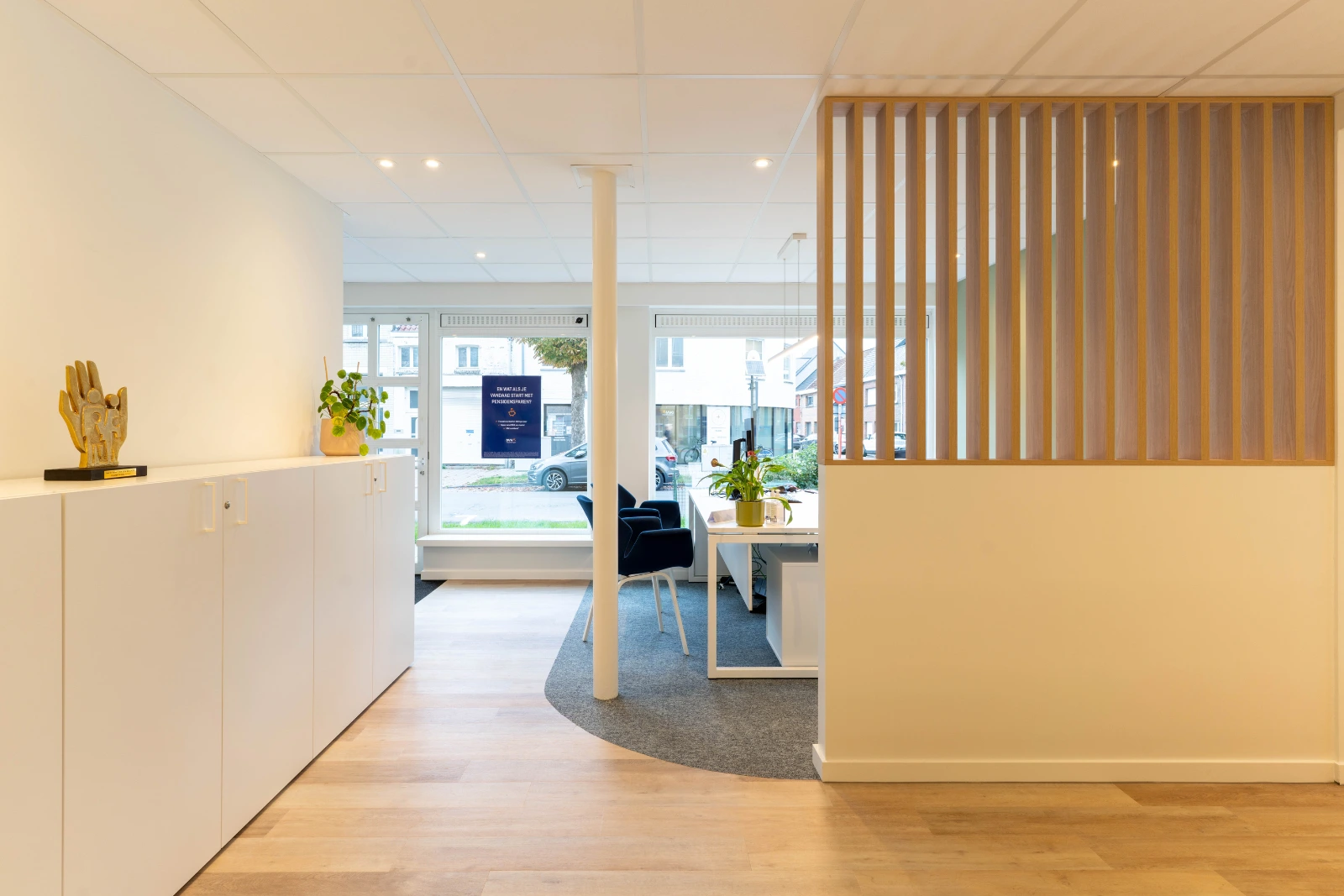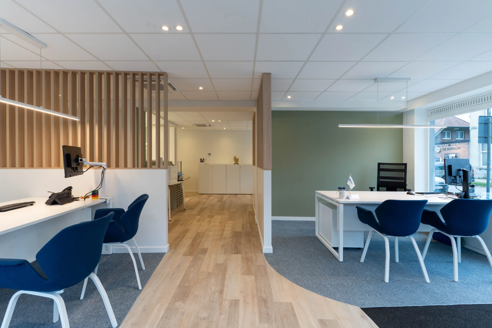 Het resultaat is een eigentijdse en functionele kantooromgeving die volledig aansluit bij de noden van het team. Dankzij de waardevolle input van de klant en de vlotte, aangename samenwerking, kunnen we spreken van een geslaagde renovatie.