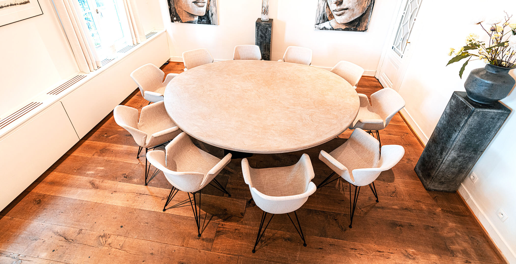 Deze Ton Sur Tooon Table, combineerbaar met de divider doordat het geheel steunt op twee tot drie afgeronde stalen poten, is ontworpen in de vorm van een kei. De tafel is afgewerkt met een procedé in cement en behandeld met tweecomponentenlak. “Dit oerdegelijk procedé komt over vanuit Zwitserland en heeft zijn sterkte bewezen op vloeren. De cement spaci wordt bevestigd op een blokplaat waarvan de afgeronde randen mee worden gecementeerd. De tafel is te verkrijgen voor zes tot acht personen of voor acht tot tien personen.”